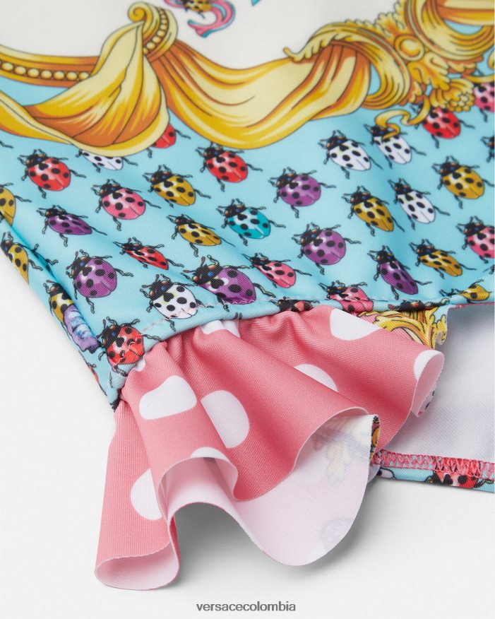 Este traje de baño de una pieza diseñado para días divertidos en la piscina o la playa presenta el divertido estampado infantil de mariposas y mariquitas y adornos con volantes.