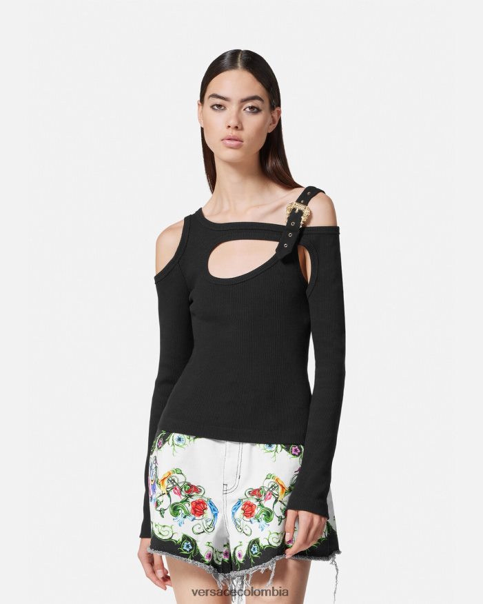 Este top acanalado de manga larga presenta detalles recortados, un diseño con hombros descubiertos y una hebilla barroca decorativa en la correa para el hombro.