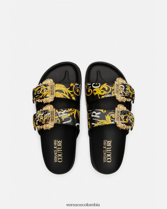 Estas sandalias de plataforma presentan un logotipo estampado de alta costura en correas brillantes con hebillas barrocas decorativas.