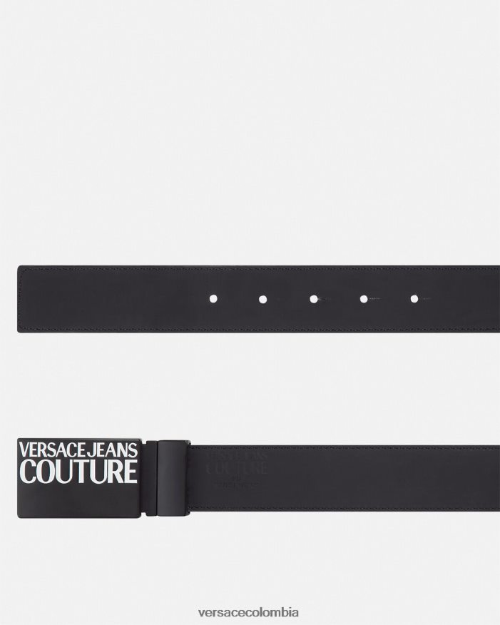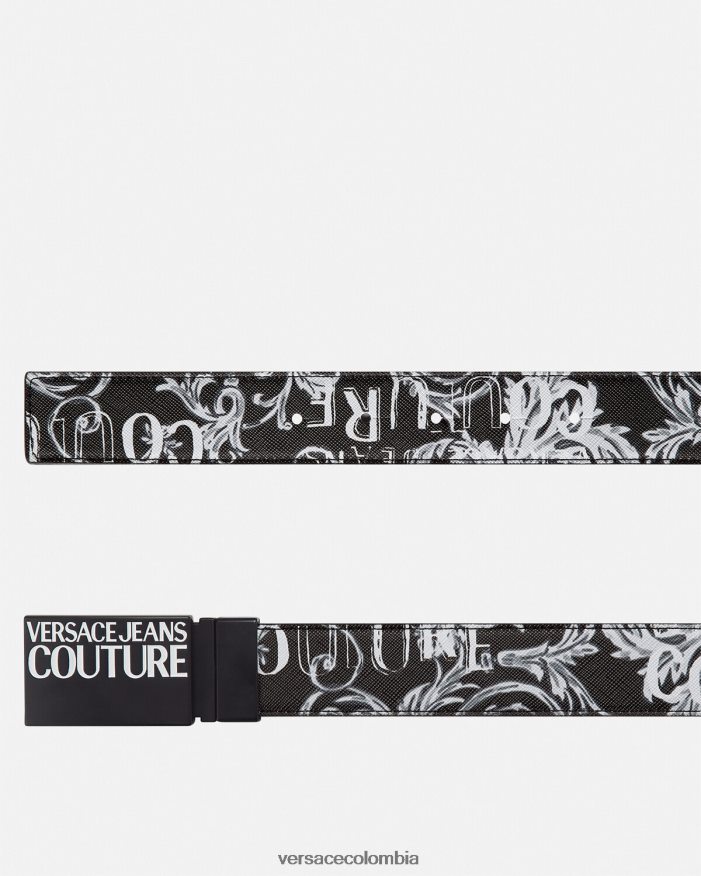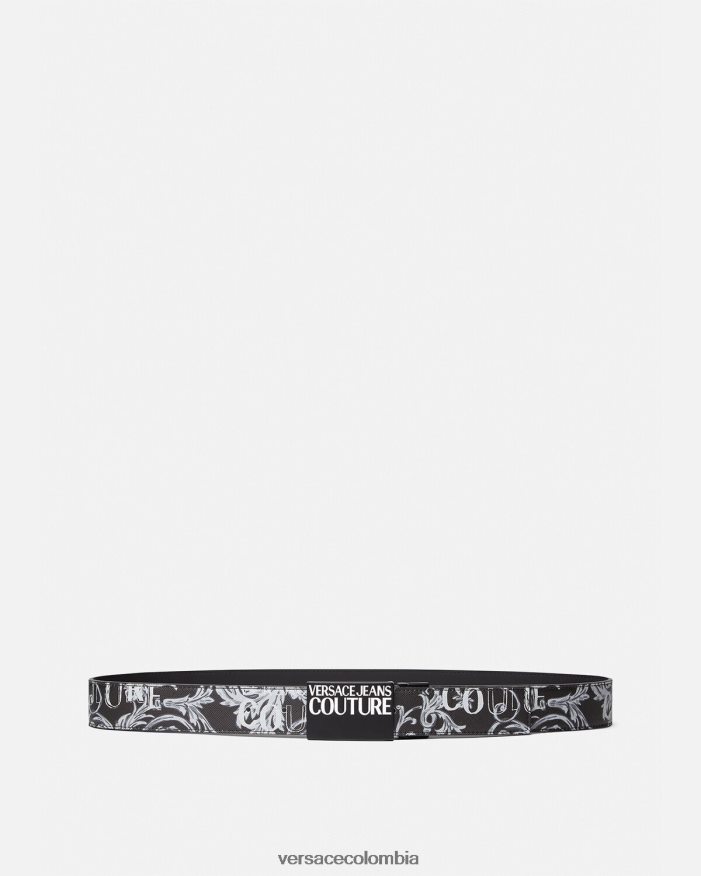 un cinturón reversible con un logotipo estampado de alta costura en un lado y una hebilla con placa giratoria y de bloqueo.