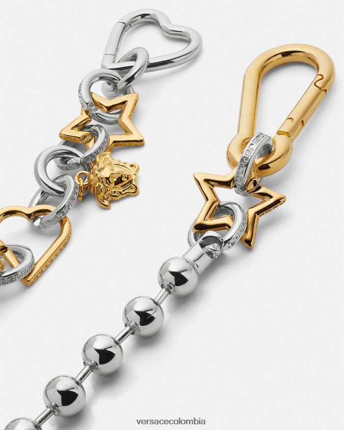 un cinturón de cadena gruesa con corazones, estrellas y dijes de medusa grabados con greca para sujetar a pantalones y presillas de jeans. Todos los productos de joyería de Versace no contienen plomo ni níquel. Todos los materiales son hipoalergénicos.