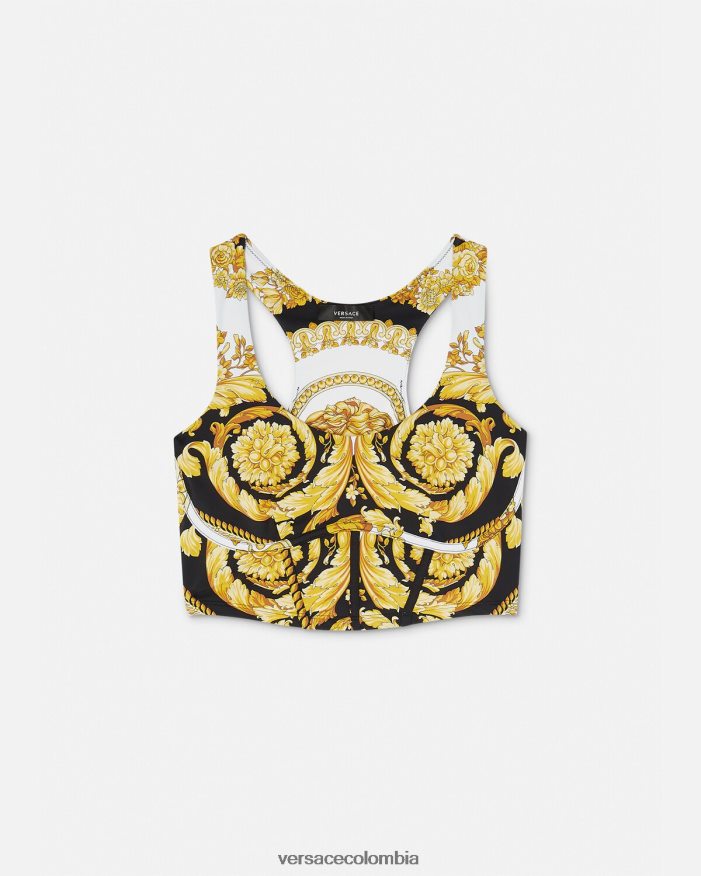Diseñado para entrenamientos de yoga de bajo impacto, este sujetador deportivo presenta una espalda cruzada y un estampado barroco en todo el material elástico y transpirable. Las costuras inspiradas en corsés añaden un toque muy versace al estilo de ropa deportiva.
