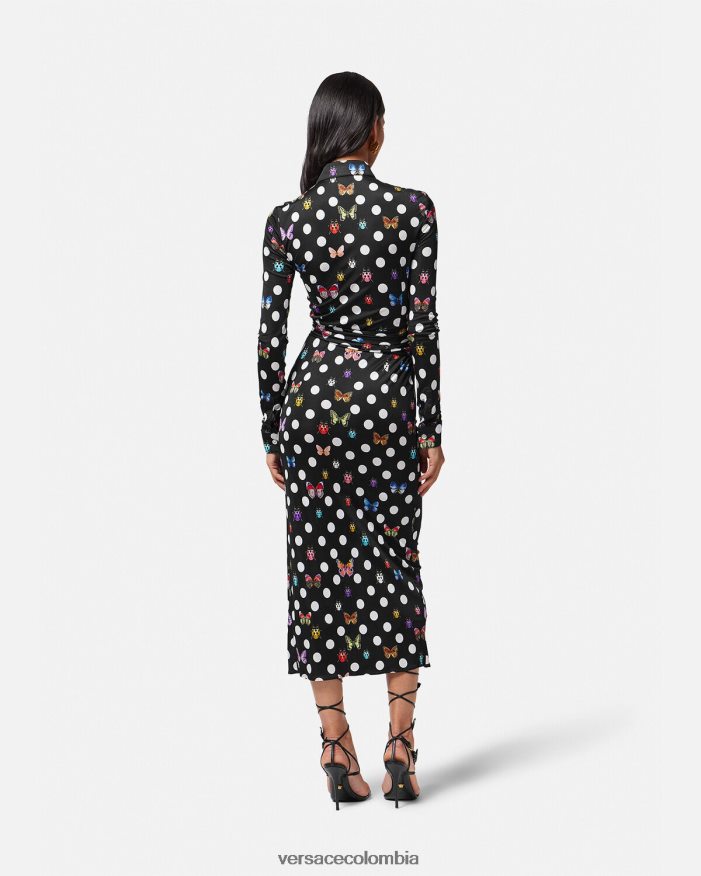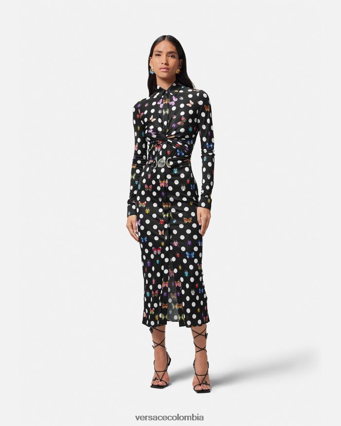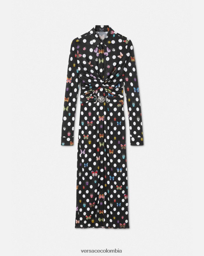 Este vestido midi camisero de punto fluido presenta un cinturón clic-clac cruzado con Medusa ’95 y un estampado integral de mariposas y mariquitas con un fondo de lunares. Este artículo forma parte de la colección cápsula codiseñada con Dua Lipa.