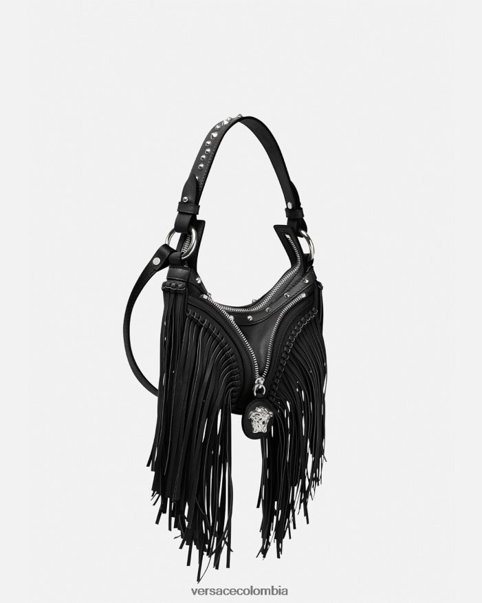 El bolso de hombro repetido, una edición mini de la silueta hobo, está confeccionado en cuero con ribetes de flecos anudados a mano y cuenta con una correa para el hombro desmontable. De inspiración motera, un tirador con dije de medusa y cremalleras diagonales añaden una actitud grunge con un toque versace.