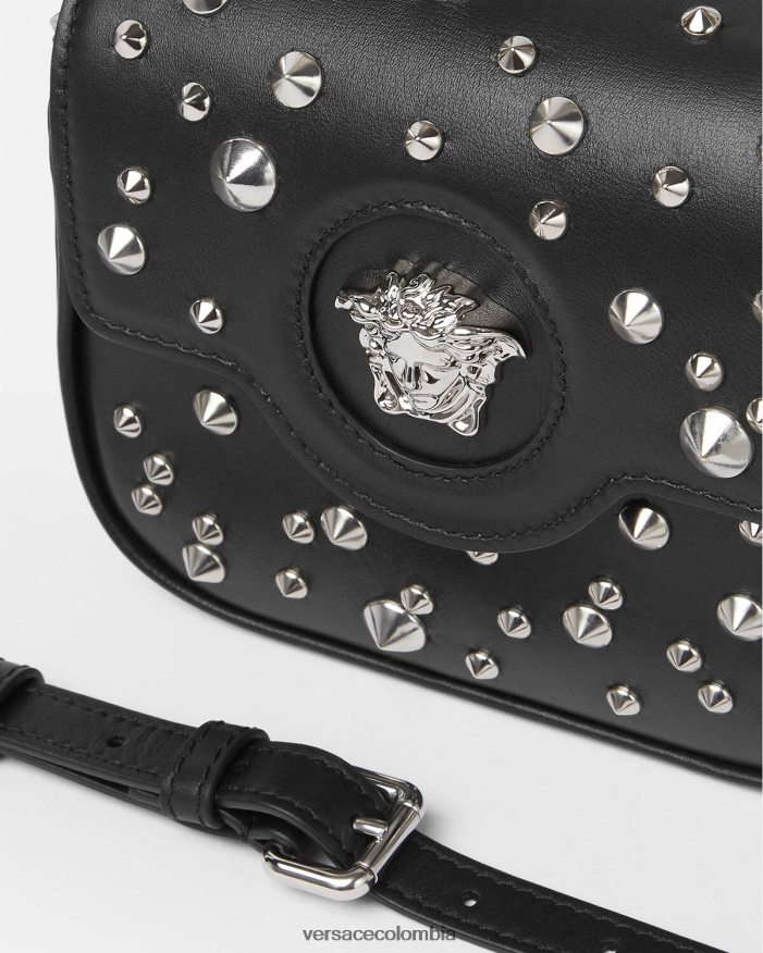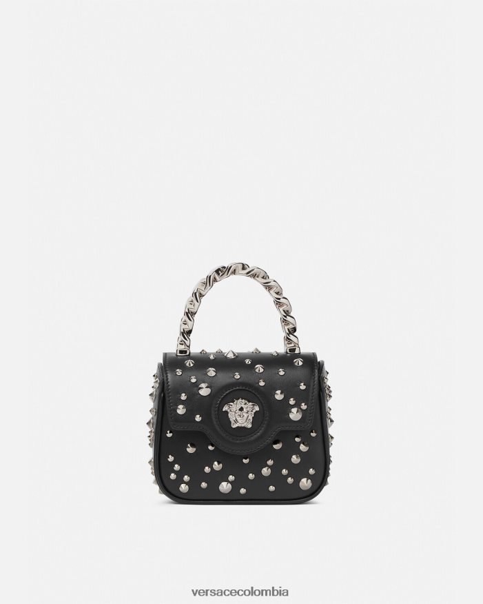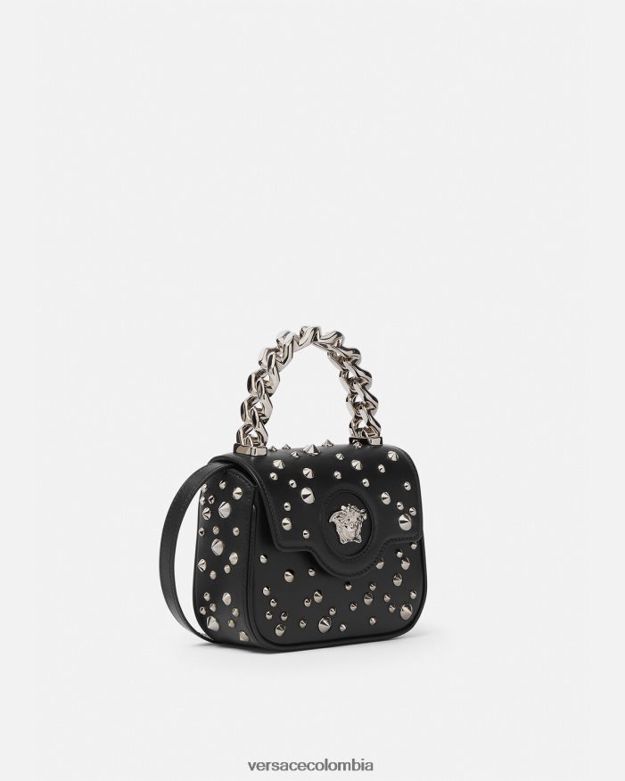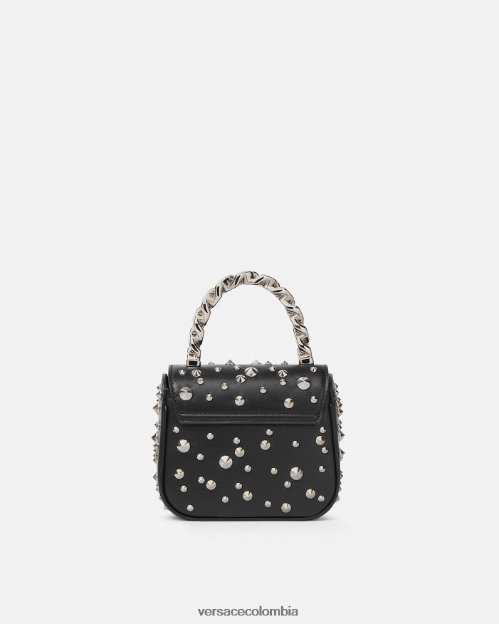 El mini bolso la medusa ha sido confeccionado en Italia con cuero granulado y está realzado con púas de metal en todas partes. la medusa central se reconoce al instante y el asa superior de cadena fija añade una opción de transporte alternativa junto con la correa para el hombro ajustable y desmontable.