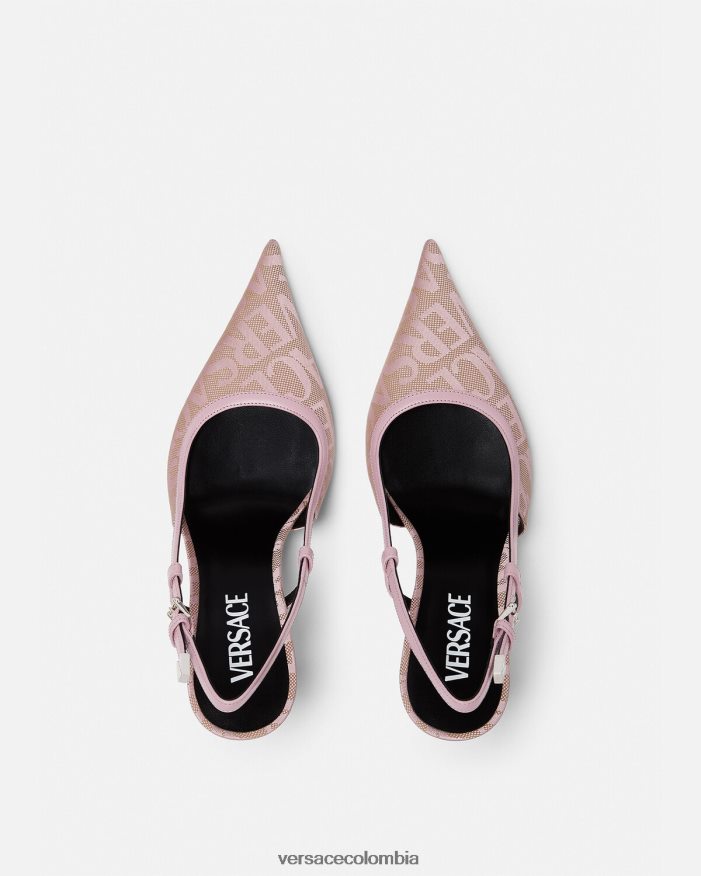 Estos zapatos de tacón con tira trasera están confeccionados en lona jacquard de Versace con adornos de cuero, con un diseño de tacón alto y puntera en punta.