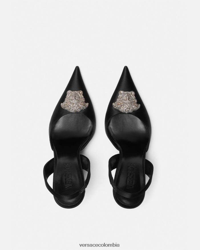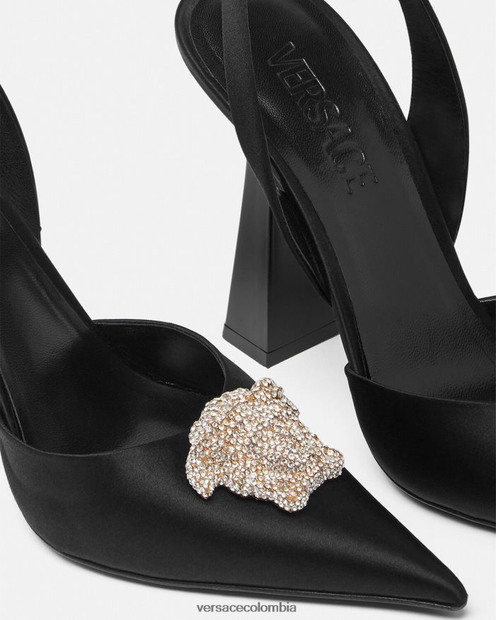 Estos zapatos destalonados, elegantes y sin esfuerzo, están confeccionados en satén suave. la elegante silueta de punta puntiaguda está adornada con una placa de medusa con incrustaciones de cristales, la decoración icónica que se encuentra en las puertas de la primera sede de la marca en Milán.
