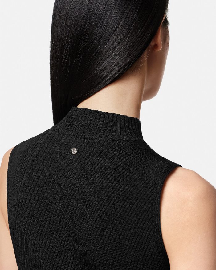 un vestido midi sin mangas y asimétrico con cuello alto acanalado, abertura frontal, costuras torcidas diagonales y una pequeña tachuela de medusa en la parte posterior.