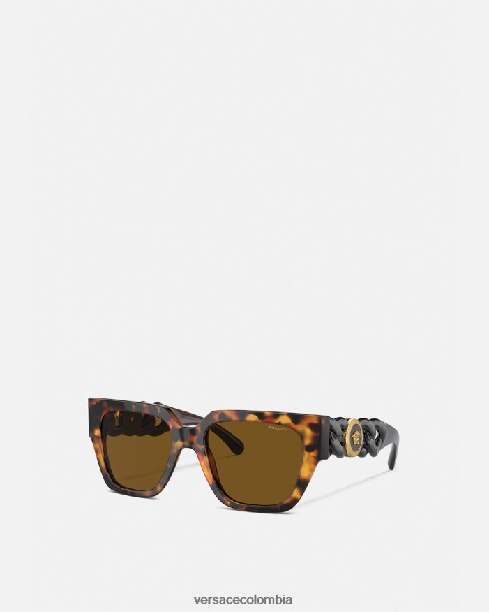 Este elegante estilo cuadrado presenta monturas de acetato y las patillas anchas están adornadas con un esmalte de Medusa sobre detalles de cadena.