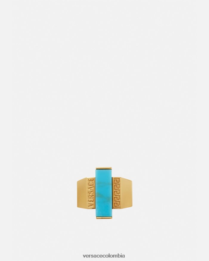 un anillo de banda ancha con letras Greca y Versace grabadas y una piedra preciosa turquesa rectangular central. Todos los productos de joyería de Versace no contienen plomo ni níquel. Todos los materiales son hipoalergénicos.