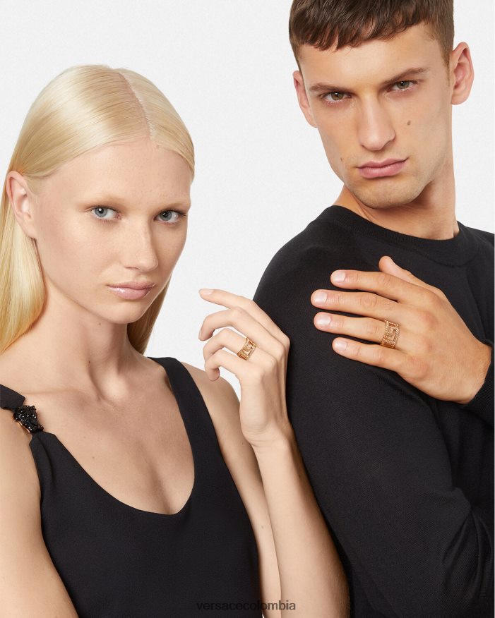 Anillo con diseño de greca y adornos de cristal. Todos los artículos de joyería de Versace no contienen plomo ni níquel.
