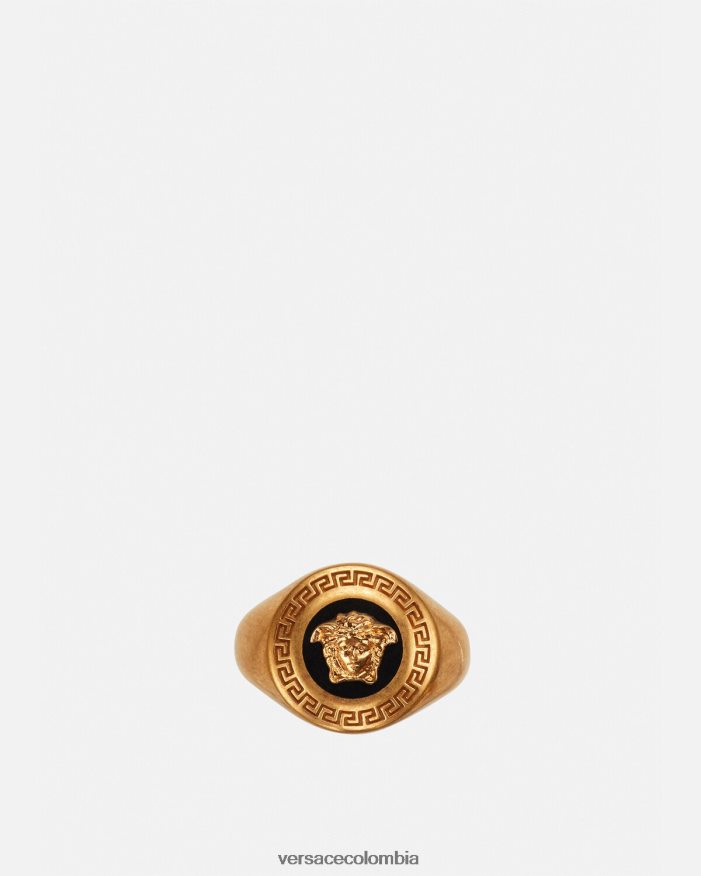 Anillo en tono dorado con cabeza de medusa central engastada dentro de esmalte de colores. Todos los productos de joyería de Versace no contienen plomo ni níquel. Todos los materiales son hipoalergénicos.