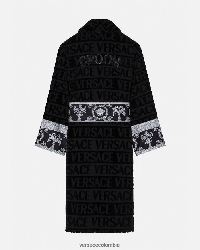Esta bata de baño larga de algodón de rizo presenta un estampado integral de jacquard tonal de Versace. El albornoz de novio adornado con cristales se puede combinar con el albornoz de novia a juego para una ocasión especial de boda. El estilo loungewear se detalla con mangas con estampado barroco en el mismo tono y un cinturón anudado.