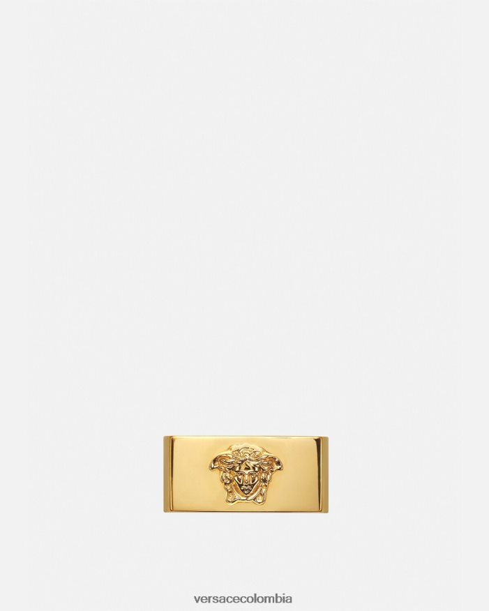 un anillo cúbico con una letra de versace grabada y una tachuela de medusa. Todos los productos de joyería de Versace no contienen plomo ni níquel. Todos los materiales son hipoalergénicos.