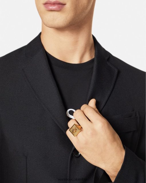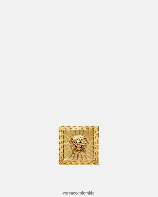 un atrevido anillo con una cabeza de medusa cuadrada, acabado en oro versace. Ninguno de los productos de joyería de Versace contiene plomo ni níquel. Todos los materiales son hipoalergénicos.