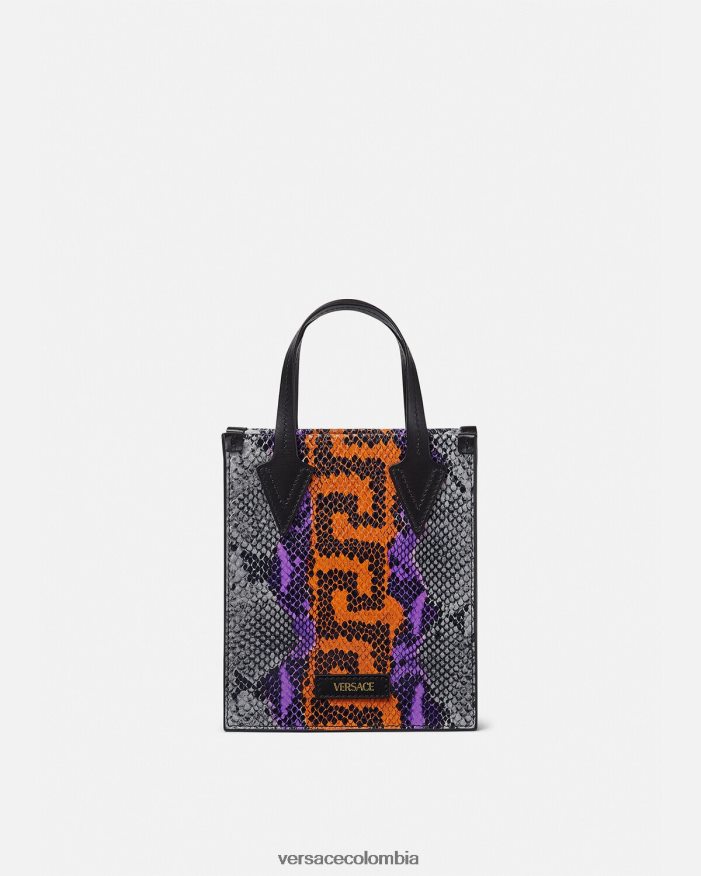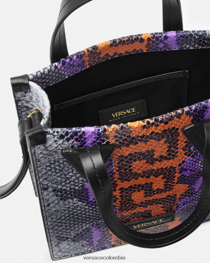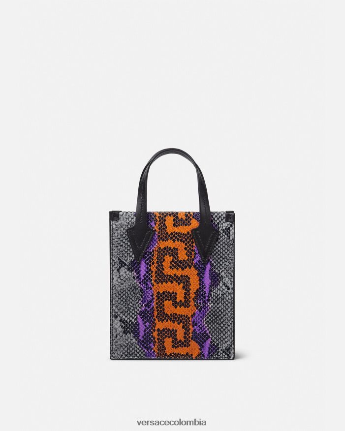 un bolso tote tipo bandolera pequeño confeccionado en piel con efecto de piel de serpiente estampada y un motivo de greca en el centro. El estilo abierto está rematado con asas superiores y una correa para el hombro ajustable.