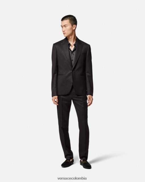 Este blazer de noche de botonadura sencilla presenta un estampado integral de La Greca en jacquard de lúrex metalizado. El estilo ajustado tiene cuello con muesca y bolsillos ribeteados.