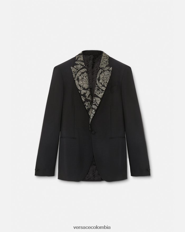 Confeccionado en una mezcla de lana y mohair, las solapas puntiagudas de este blazer de botonadura sencilla presentan resistentes tachuelas de metal con un patrón de silueta barroca. Con un solo frente abotonado, este estilo formal está detallado con bolsillos ribeteados y un forro con estampado de La Greca.