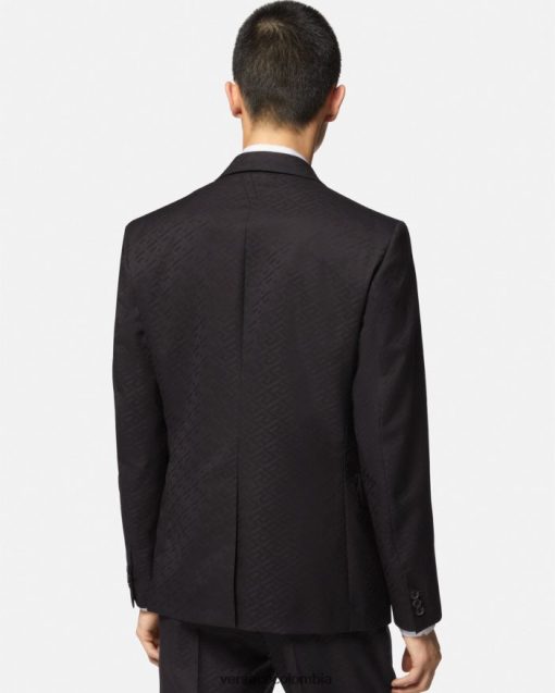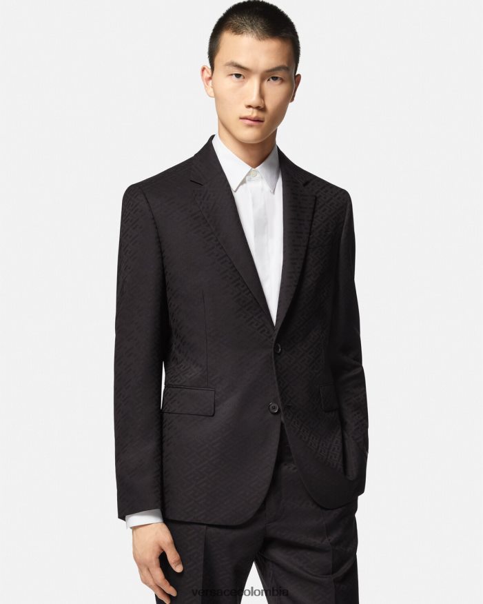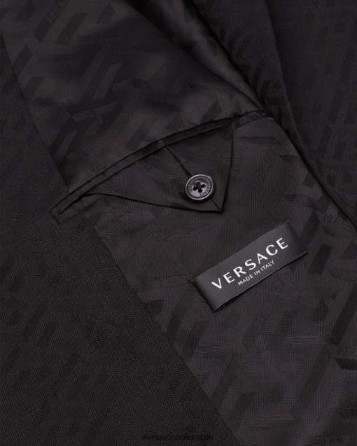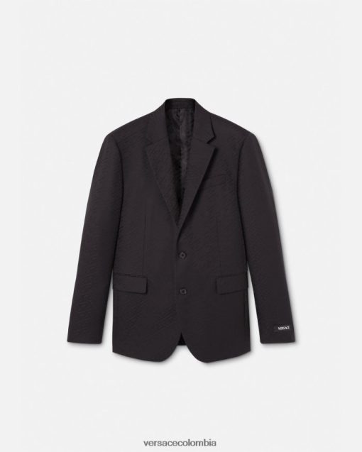 Una versión de Versace del traje de noche, este blazer de botonadura sencilla presenta un patrón de La Greca tonal en jacquard y una etiqueta con el logo en una manga.