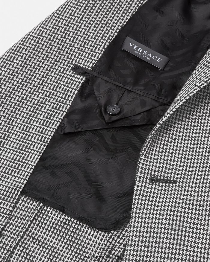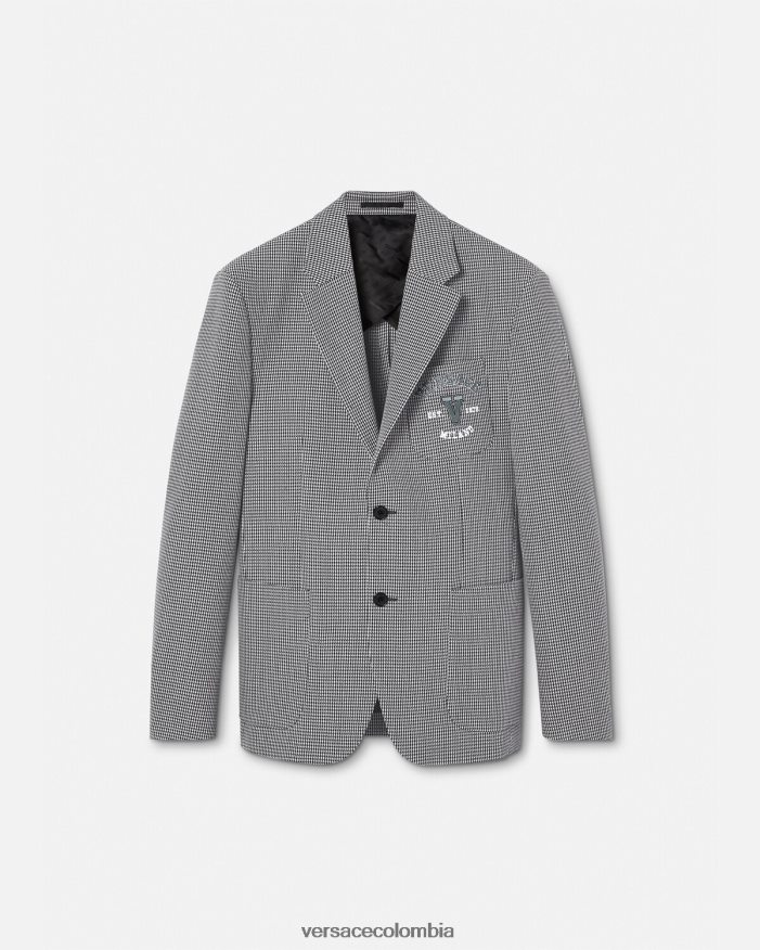 Confeccionado con lana compacta de pata de gallo, este blazer de botonadura sencilla tiene un forro parcial para un corte entallado e informal. Con solapa de muesca y cierre de dos botones, este estilo sartorial se detalla con un logotipo universitario bordado en el bolsillo del pecho, un símbolo orgulloso de pertenecer a la familia versace.