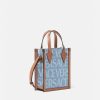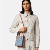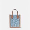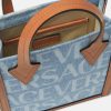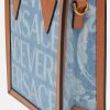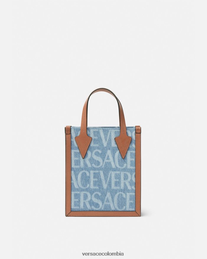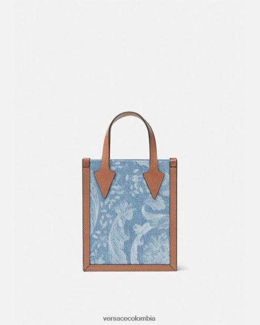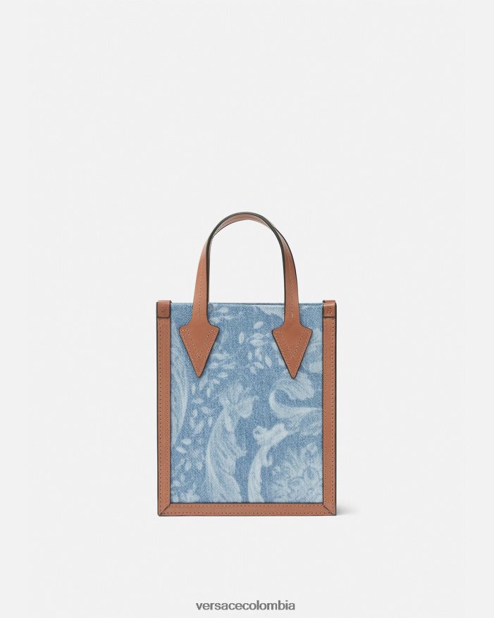 un pequeño bolso bandolera confeccionado con paneles de mezclilla grabados con láser con el patrón de silueta barroco y integral de Versace con ribetes de cuero. El estilo abierto está rematado con asas de cuero y una correa para el hombro ajustable y extraíble.
