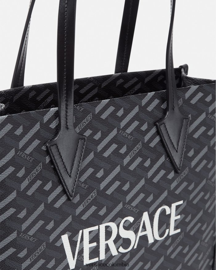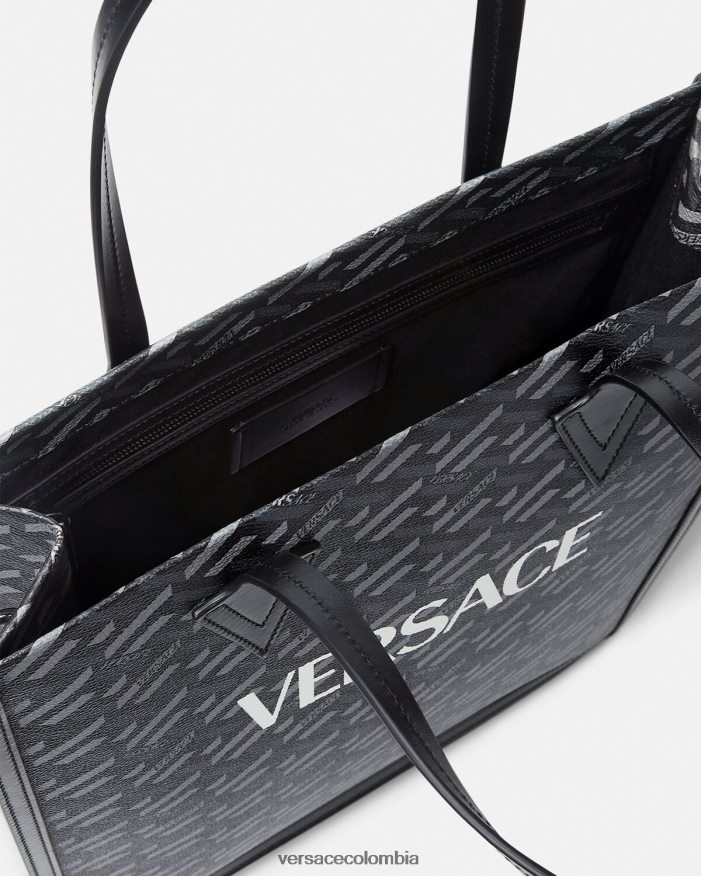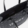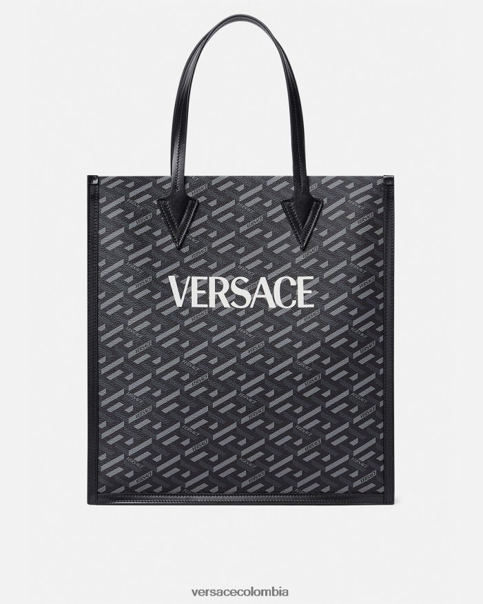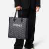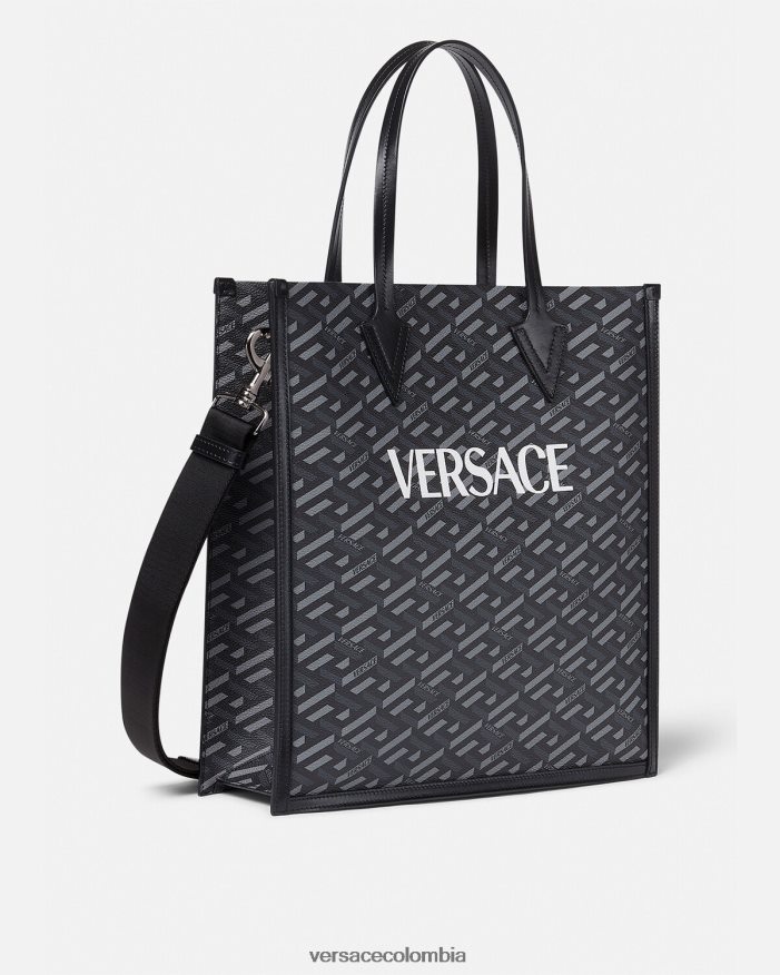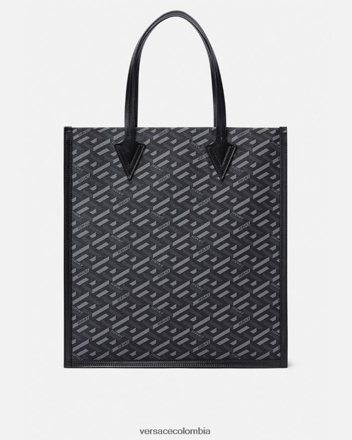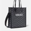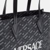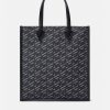 Confeccionado con lona revestida de La Greca y ribetes de cuero, este bolso tote alto tiene un diseño espacioso y se completa con una correa desmontable para mayor practicidad.