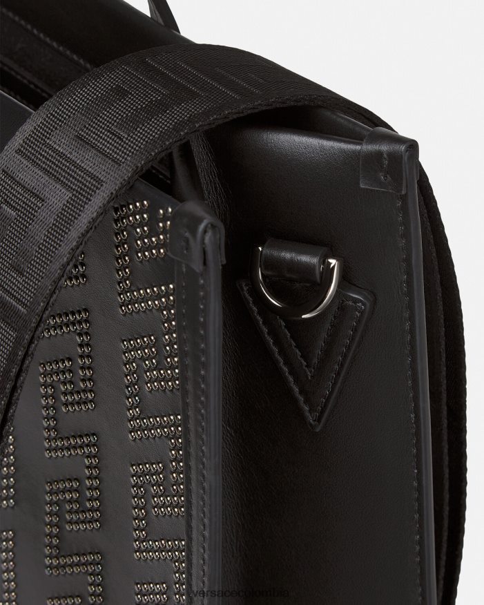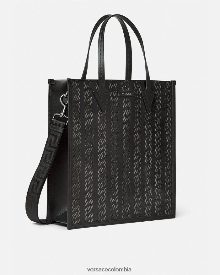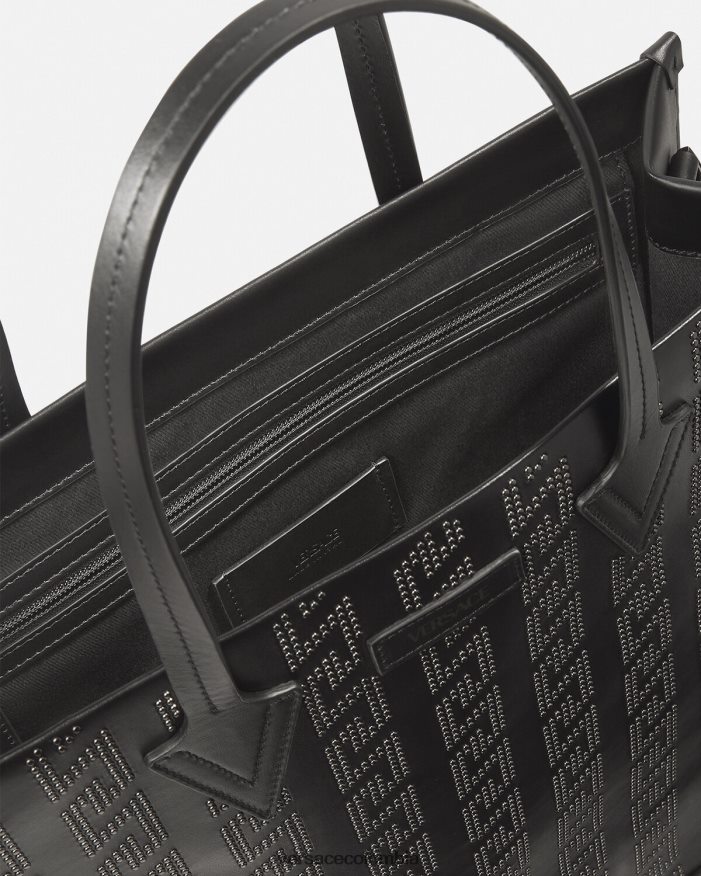 Este bolso tote estructurado, de diseño práctico, presenta tachuelas con un patrón de greca y ranuras internas para tarjetas. El modelo se puede llevar cruzado con la correa ajustable para el hombro o sujetado por las asas superiores para lograr un estilo versátil.