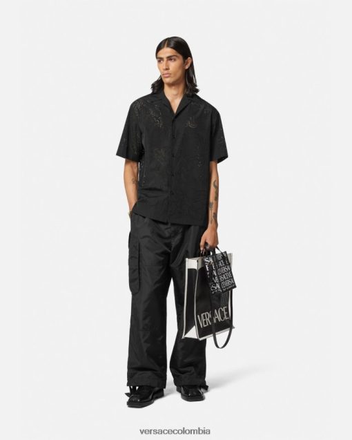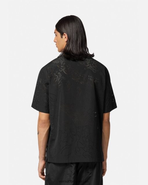 Esta camisa de manga corta, confeccionada en popelín de algodón con un corte cuadrado, presenta un motivo barroco perforado y cortado con láser en toda su extensión. un cuello relajado con muescas y un frente abotonado completan el estilo.