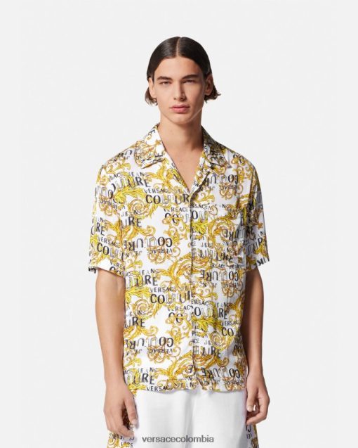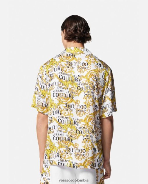 Esta camisa de manga corta presenta un estampado de alta costura con logo en toda la prenda en un tejido fluido.