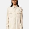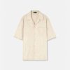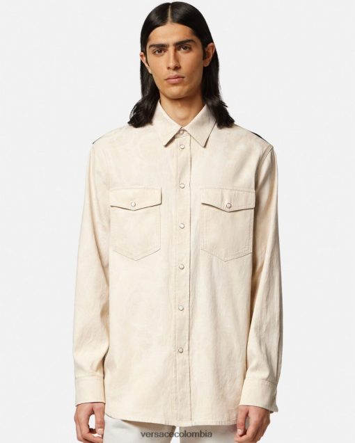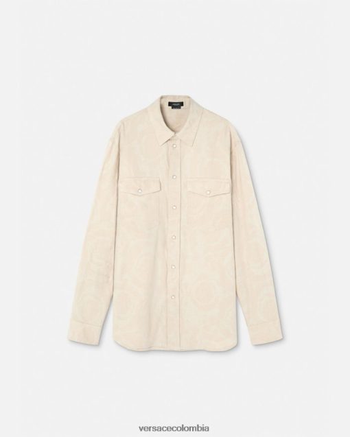 Esta camisa de mezclilla ligera de cambray presenta un patrón de jacquard de silueta barroca y botones a presión de nácar de medusa.