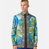Confeccionada en sarga de seda con un corte regular y fluido, esta camisa de manga larga tiene cierre frontal con botones, cuello puntiagudo y el estampado le maschere, una referencia clásica al teatro y la ópera en colores gráficos pop.