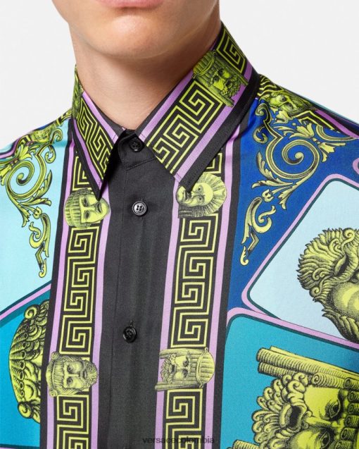 Confeccionada en sarga de seda con un corte regular y fluido, esta camisa de manga larga tiene cierre frontal con botones, cuello puntiagudo y el estampado le maschere, una referencia clásica al teatro y la ópera en colores gráficos pop.