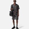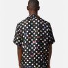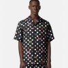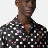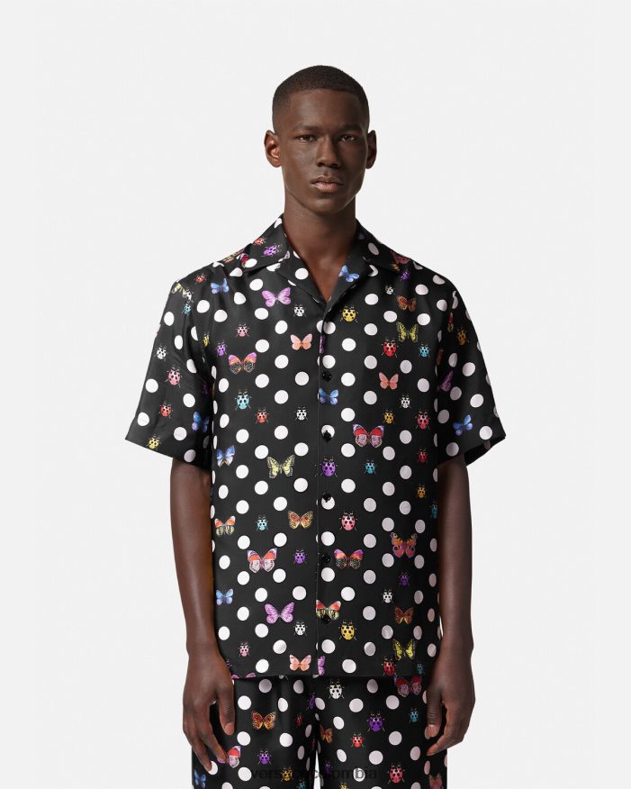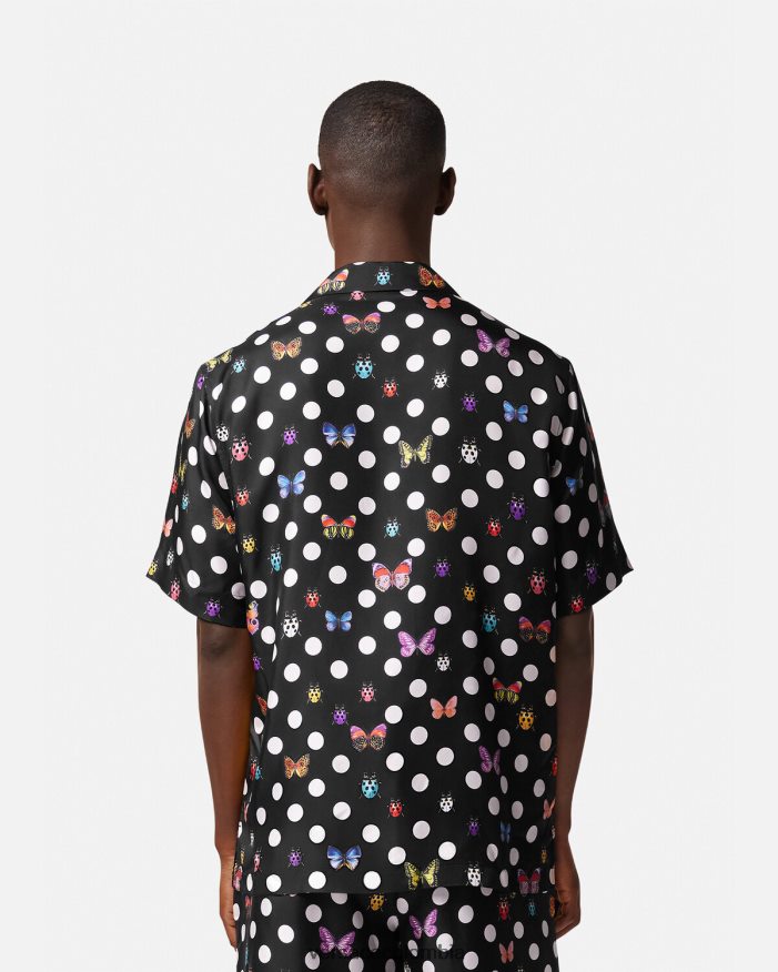 una camisa de seda de manga corta con lunares y motivos integrales de mariposas y mariquitas con cuello con muescas.