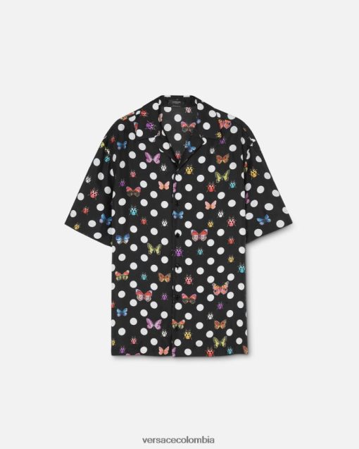 una camisa de seda de manga corta con lunares y motivos integrales de mariposas y mariquitas con cuello con muescas.
