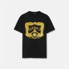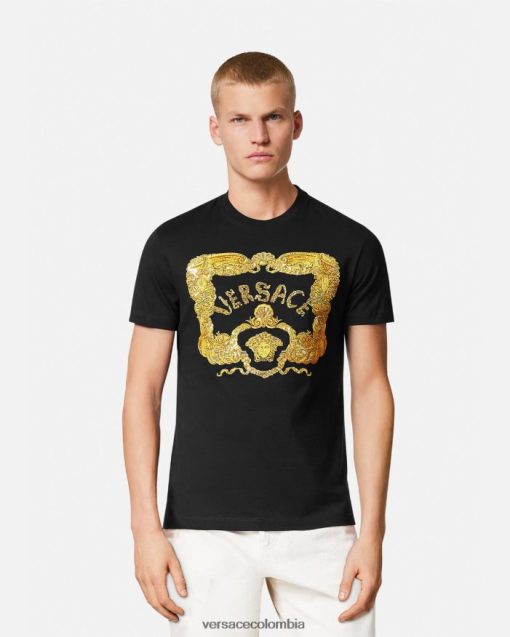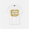 Esta camiseta de manga corta de punto de algodón tiene un corte entallado y presenta un motivo barroco de concha bordado y adornado con cristales en la parte delantera.