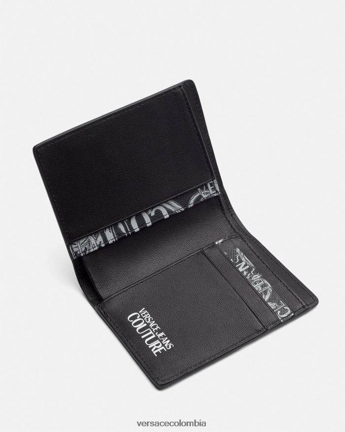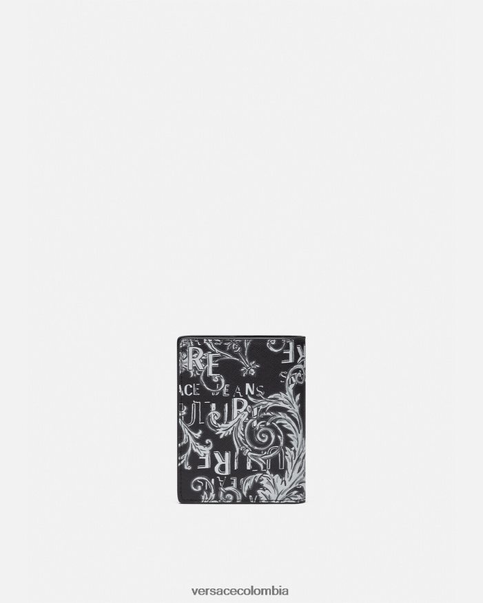 una billetera de cuero con estampado de alta costura con logotipo y múltiples ranuras interiores para tarjetas y compartimentos para billetes.