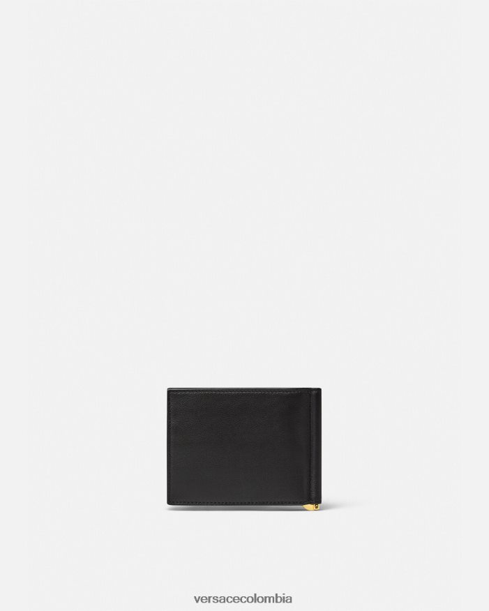 Este tarjetero plegable, confeccionado en piel de becerro flexible, presenta un adorno de Medusa Biggie. la billetera tiene seis ranuras para tarjetas internas y un clip para billetes en tono dorado.