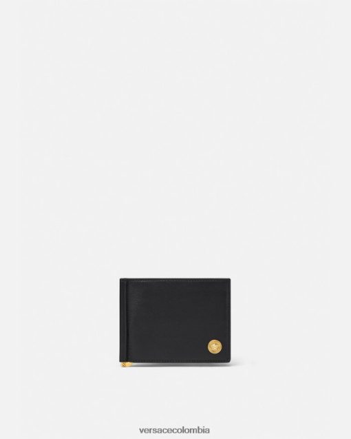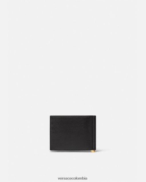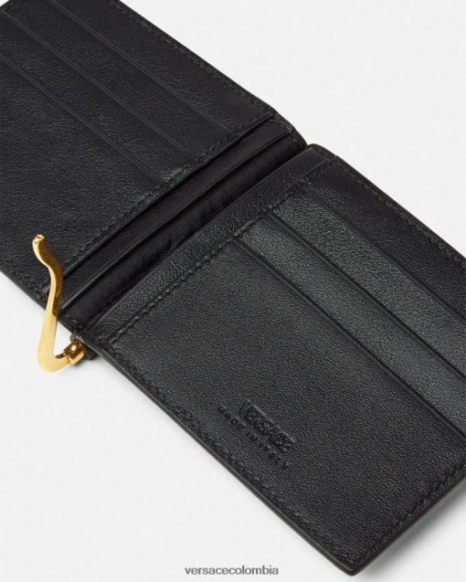 Este tarjetero plegable, confeccionado en piel de becerro flexible, presenta un adorno de Medusa Biggie. la billetera tiene seis ranuras para tarjetas internas y un clip para billetes en tono dorado.