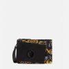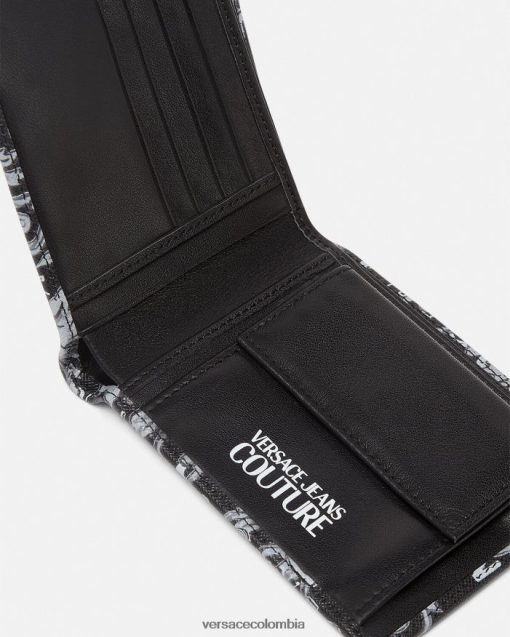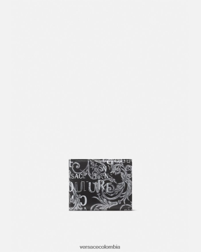 una billetera de cuero con estampado de alta costura y logotipo con múltiples ranuras para tarjetas en el interior, un monedero y compartimentos para billetes.