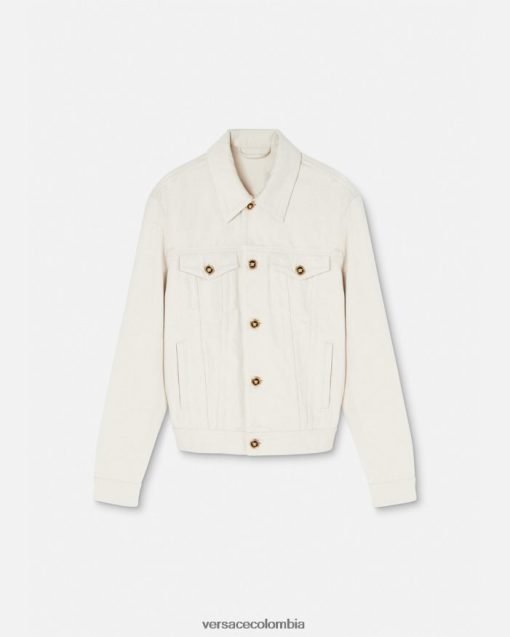Esta chaqueta vaquera de manga larga con botones está realzada con detalles metálicos de Medusa esmaltados. la parte posterior presenta una correa grande de medusa con cierre clic-clac para un ajuste ajustado.