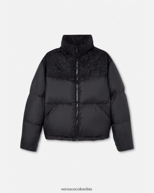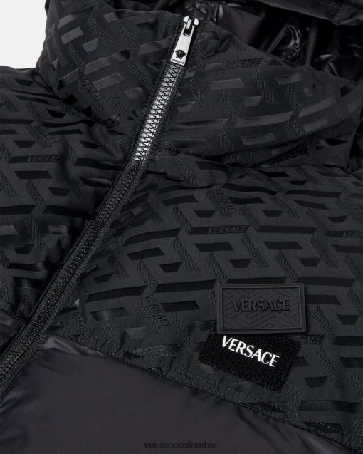Esta chaqueta acolchada, de estilo acolchado, presenta un diseño de paneles con un estampado de La Greca tonal. El estilo de cuello alto se detalla con una capucha ligera y tiene un parche con el logo extraíble en el pecho.