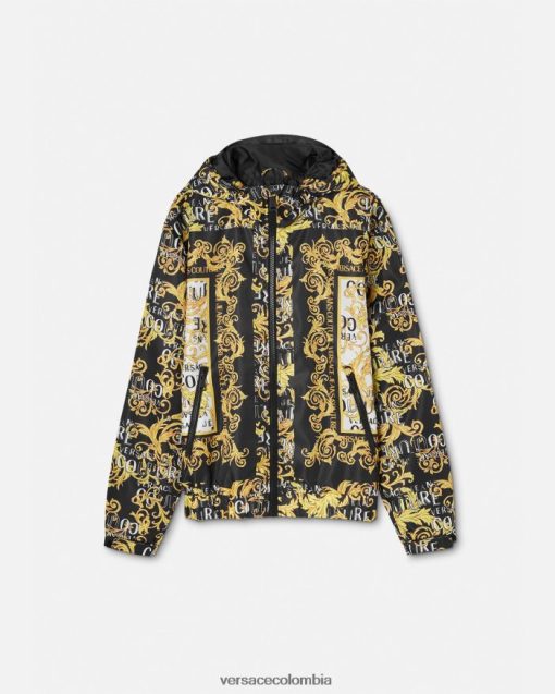 Esta chaqueta de nailon con cremallera presenta un logotipo estampado de alta costura y tiene un cierre frontal con cremallera y capucha.