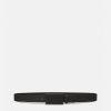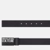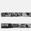 un cinturón reversible con un logotipo estampado de alta costura en un lado y una hebilla con placa giratoria y de bloqueo.