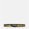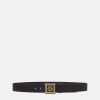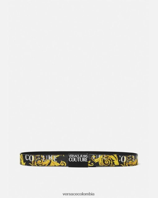 un cinturón reversible con un logotipo estampado de alta costura en un lado y una hebilla con placa giratoria y de bloqueo.