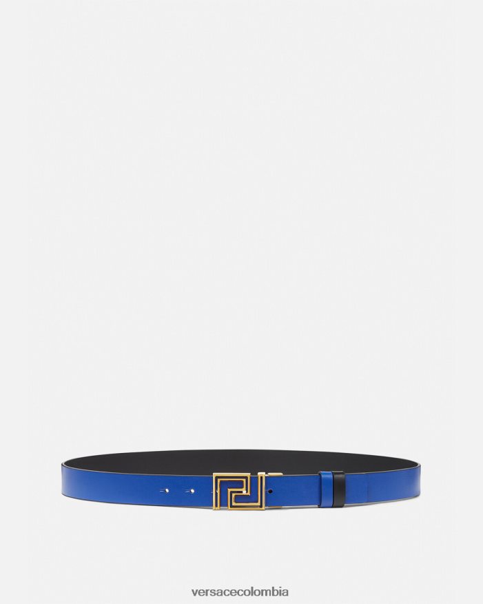 Este cinturón reversible, confeccionado en piel lisa en tonos contrastantes, cuenta con una hebilla de greca.