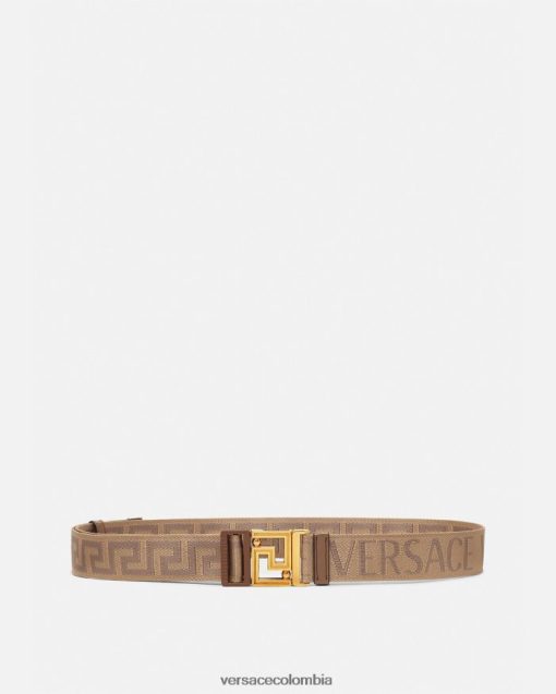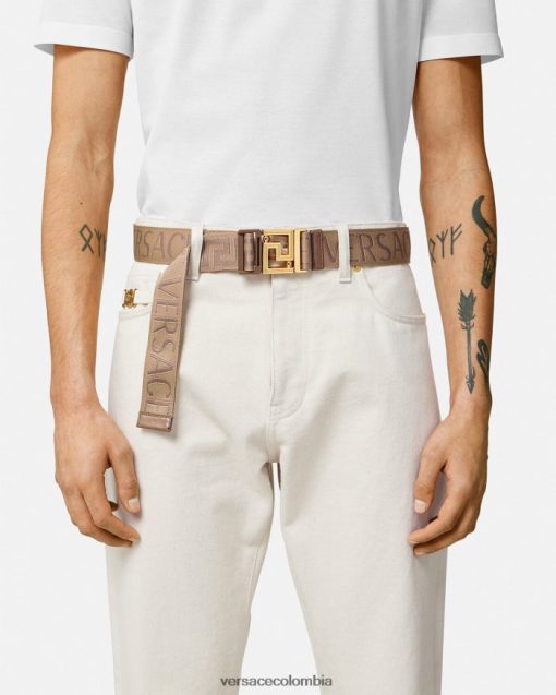Este cinturón de tela de doble cara presenta un motivo de greca en jacquard en un lado y un estampado integral de Versace en el otro. El modelo ajustable tiene una hebilla Greca y está acabado con ribetes de cuero.