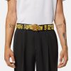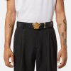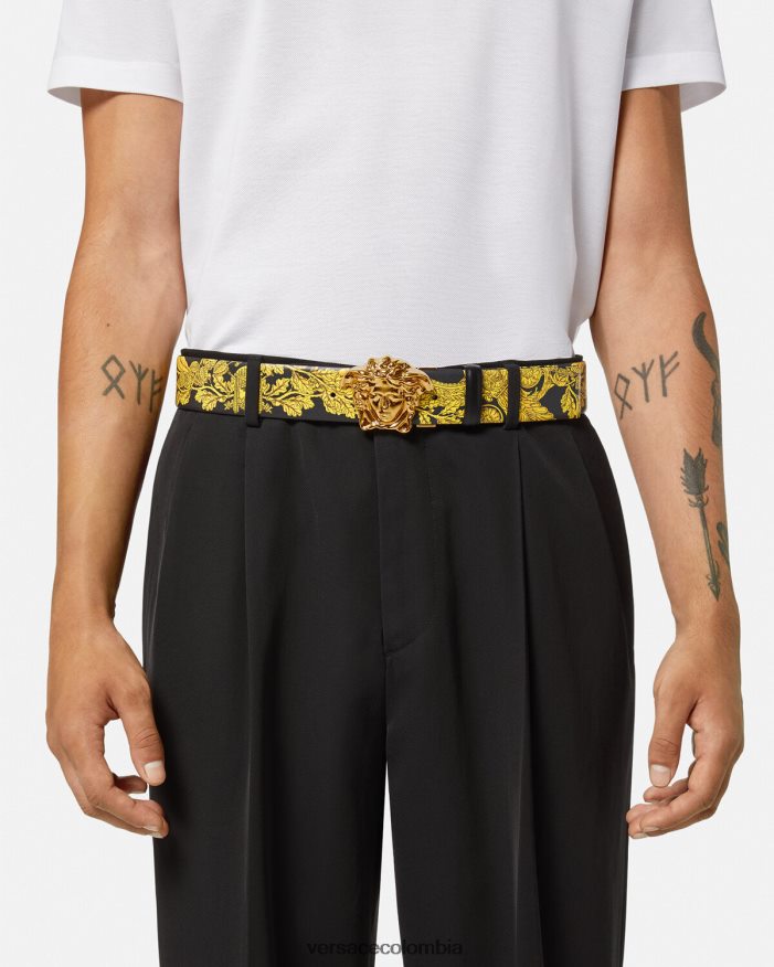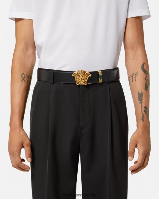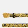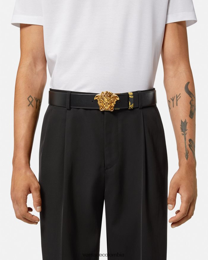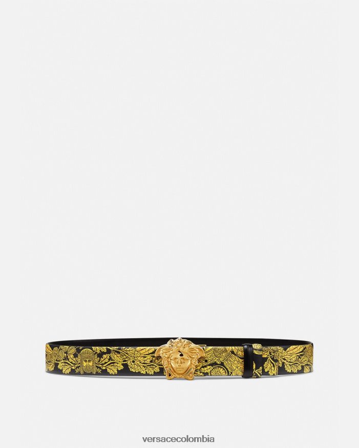 Este cinturón reversible, liso por un lado y estampado con el motivo barroco de maschera por el otro, está confeccionado en piel con una hebilla de medusa.