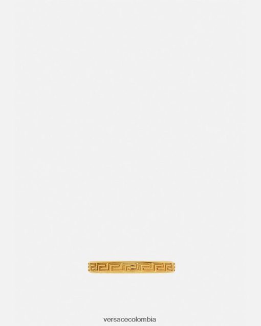 Anillo en tono dorado grabado con llaves griegas y logotipo en la banda interior.