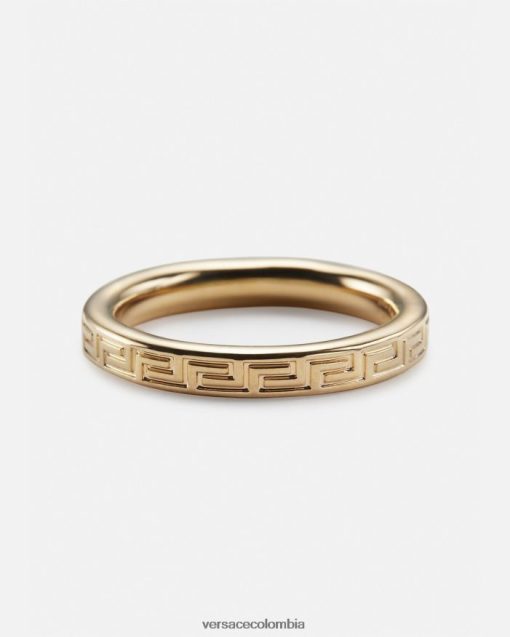Anillo en tono dorado grabado con llaves griegas y logotipo en la banda interior.