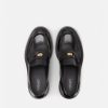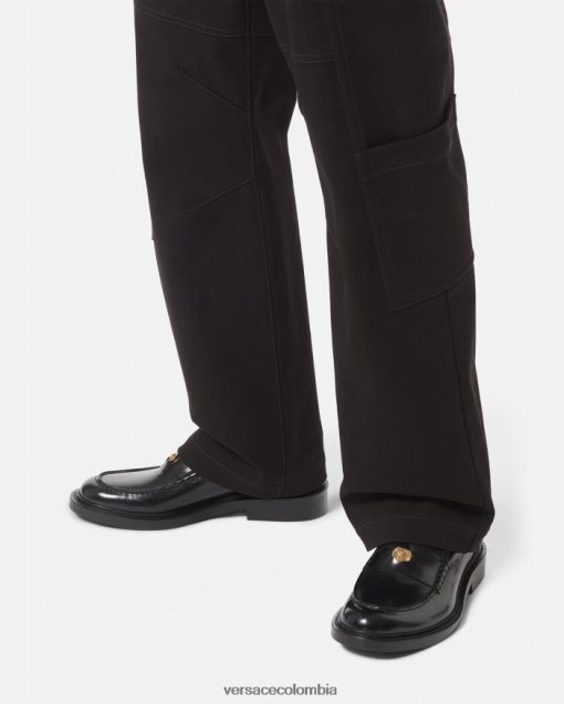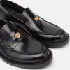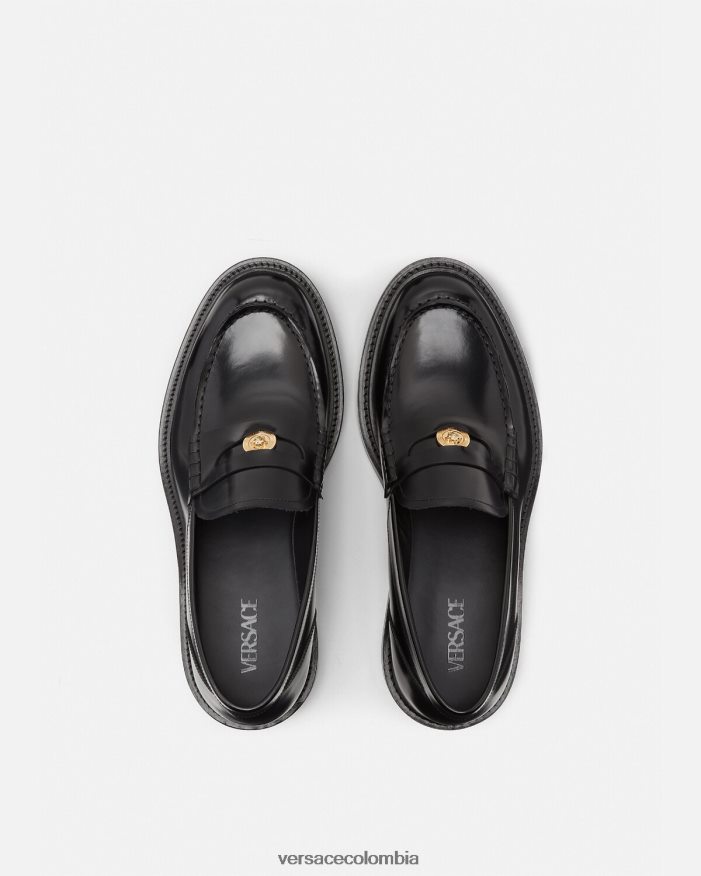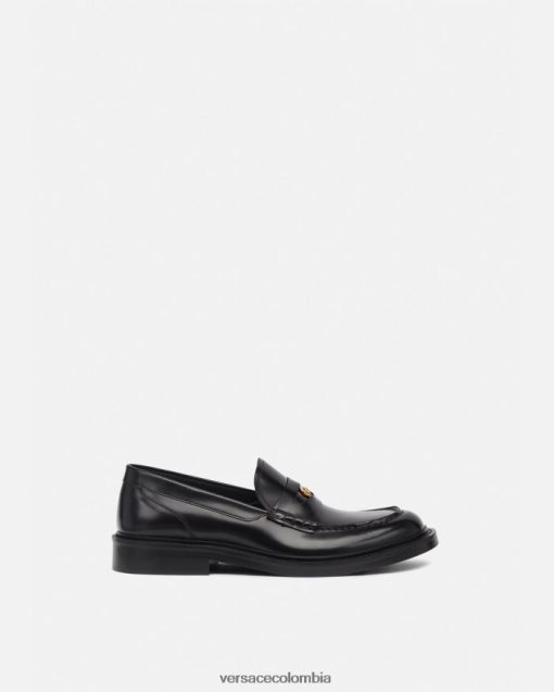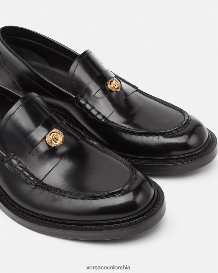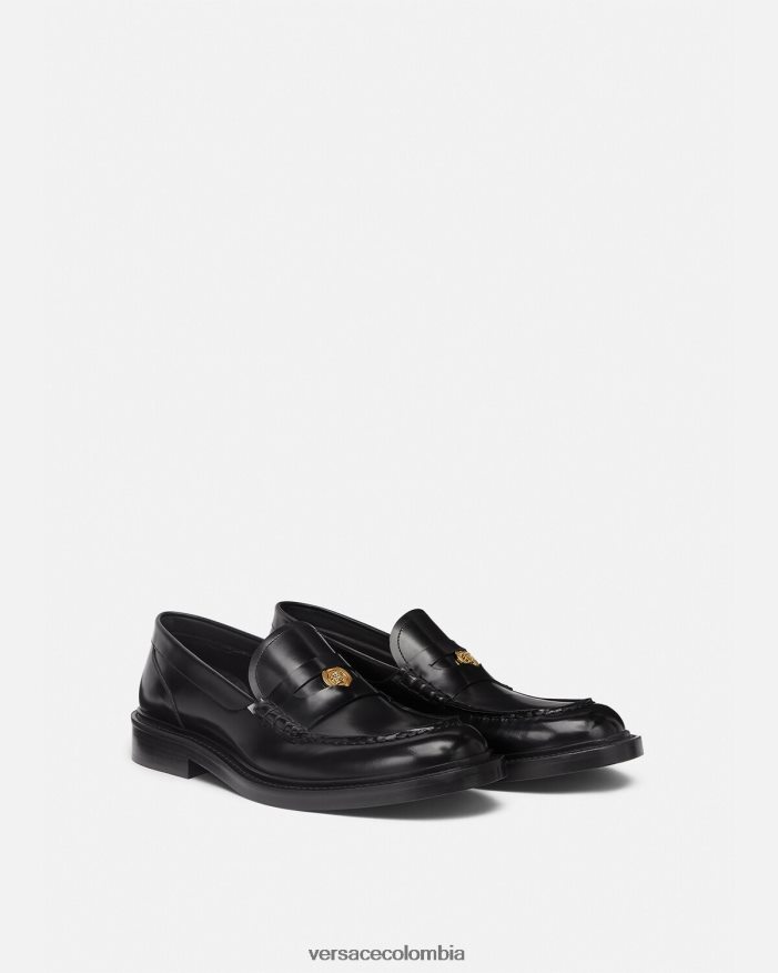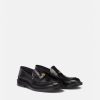 Estos mocasines pulidos, confeccionados en Italia con cuero liso, tienen un diseño sin cordones, acentuado por un emblema de medusa en la correa tipo penny.